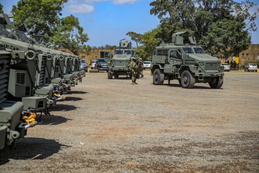 Military officers guarding the Mine Resistant Ambush Protected (MRAP) Standard Duty Vehicles at General Service Unit (GSU) headquarters, Ruaraka, on March 6, 2025. /KIPCHUMBA MURKOMEN